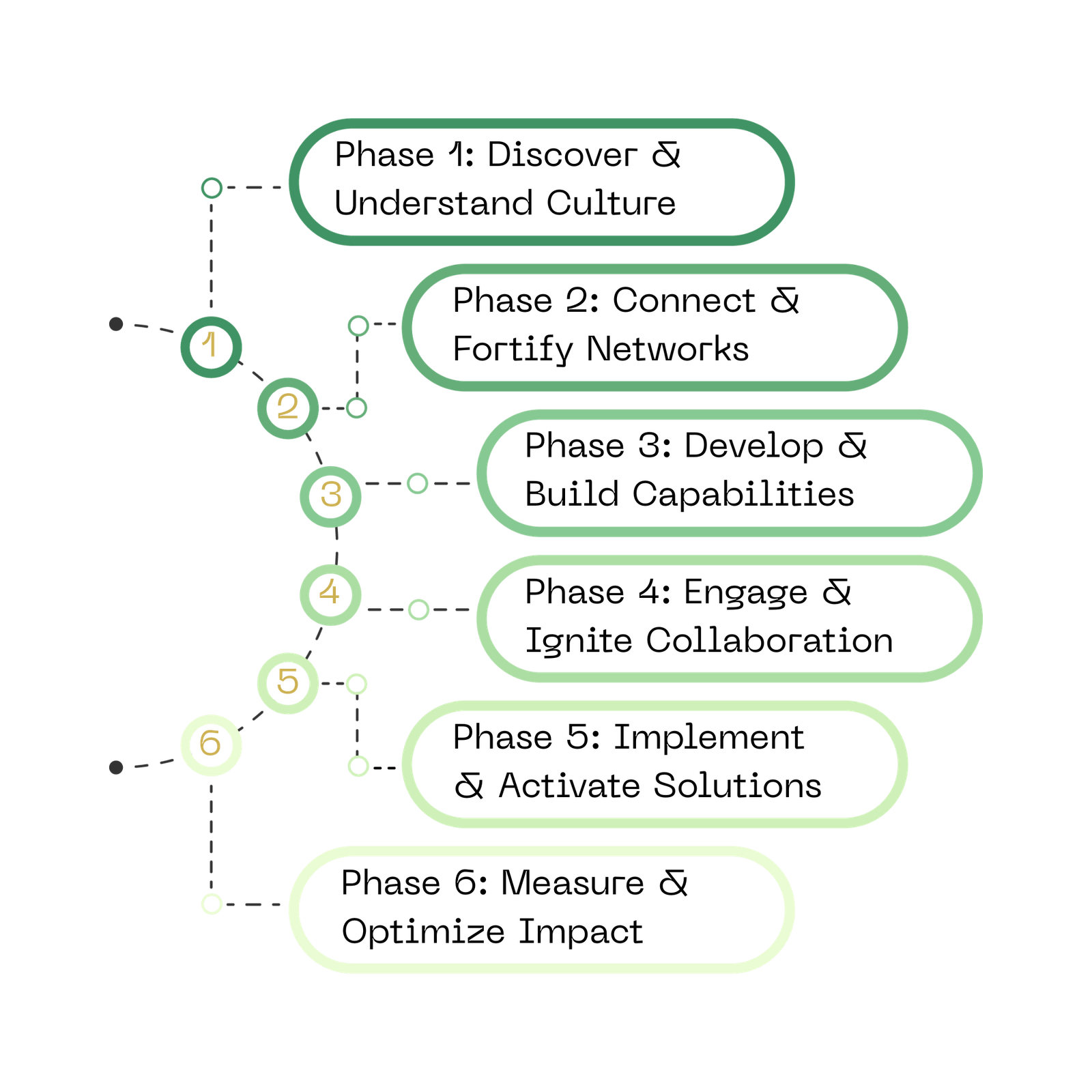 This comprehensive pathway unfolds through six carefully orchestrated phases, each building preparedness for the next, ensuring a holistic and deeply embedded transformation.
